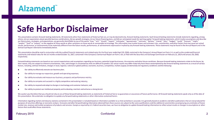 Safe Harbor Disclaimer This presentation contains forward - looking statements. All statements other than statements of historical fact are, or may be de emed to be, forward - looking statements. Such forward - looking statements include statements regarding, among others, (a) our expectations about possible business combinations, (b) our growth strategies, (c) our future financing plans, an d (d) our anticipated needs for working capital. Forward - looking statements, which involve assumptions and describe our future plans, strategies, and expectations, are generally identifiable by use of the words “may,” “will,” “should,” “expe ct, ” “anticipate,” “approximate,” “estimate,” “believe,” “intend,” “plan,” “budget,” “could,” “forecast,” “might,” “predict,” “shall” or “project,” or the negative of these words or other variations on these words or comparable terminology. Th is information may involve known and unknown risks, uncertainties, and other factors that may cause our actual results, performance, or achievements to be materially different from the future results, performance, or achievements expres sed or implied by any forward - looking statements. These statements may be found in the Annual Report and in the Semiannual Report referred to immediately below. This presentation should be read in conjunction with the audited financial statements and related notes for the fiscal year e nde d April 30, 2018, contained in the Company’s Annual Report on Form 1 - K, as well as the condensed financial statements and related notes for the six months ended October 31, 2017, contained in the Company’s Semiannual Report on Form 1 - S A, as filed with the Securities and Exchange Commission on February 21, 2019 and January 30, 2018, respectively. Forward - looking statements are based on our current expectations and assumptions regarding our business, potential target busine sses, the economy and other future conditions. Because forward - looking statements relate to the future, by their nature, they are subject to inherent uncertainties, risks, and changes in circumstances that are difficult to predict. Our actual results may differ materially from those contemplated by the forward - looking statements as a result of various factors, including, without limitation, changes in local, regional, national or global political, economic, business, competi tiv e, market (supply and demand) and regulatory conditions and the following: ■ Our ability to effectively execute our business plan; ■ Our ability to manage our expansion, growth and operating expenses; ■ Our ability to evaluate and measure our business, prospects and performance metrics; ■ Our ability to compete and succeed in a highly competitive and evolving industry; ■ Our ability to respond and adapt to changes in technology and customer behavior; and ■ Our ability to protect our intellectual property and to develop, maintain and enhance a strong brand. We caution you therefore that you should not rely on any of these forward - looking statements as statements of historical fact or as guarantees or assurances of future performance. All forward - looking statements speak only as of the date of this presentation. We undertake no obligation to update any forward - looking statements or other information contained herein. Information regarding market and industry statistics contained in this presentation is included based on information availabl e t o us that we believe is accurate. It is generally based on academic and other publications that are not produced for purposes of securities offerings or economic analysis. Forecasts and other forward - looking information obtained from these sourc es are subject to the same qualifications and the additional uncertainties accompanying any estimates of future market size, revenue and market acceptance of products and services. Except as required by U.S. federal securities laws, we h ave no obligation to update forward - looking information to reflect actual results or changes in assumptions or other factors that could affect those statements. February 2019 Confidential Alzamend ™ 2