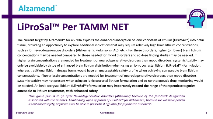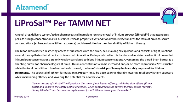 LiProSal™ Per TAMM NET A novel drug delivery system/active pharmaceutical ingredient ionic co - crystal of lithium product (LiProSal™) that attenuates peak - to - trough concentrations via sustained - release properties yet additionally bolsters/stabilizes the ratio of brain - to - serum concentrations (enhances brain lithium exposure) could revolutionize the clinical utility of lithium therapy. The blood - brain barrier, restricting access of substances into the brain, occurs along all capillaries and consists of tight jun ctions around the capillaries that do not exist in normal circulation. Perhaps related to this barrier and as stated earlier, it is kno wn that lithium brain concentrations are only weakly correlated to blood lithium concentrations. Overcoming the blood - brain barrier is a daunting hurdle for pharmacologists. If brain lithium concentrations can be increased and/or be more reproducible/less variab le while the total body lithium burden can be decreased, the benefit - to - risk profile may be favorably improved for lithium treatments . The cocrystal of lithium formulation (LiProSal™) may be dose - sparing, thereby lowering total body lithium exposure while maintaining efficacy, and lowering the potential for adverse events. February 2019 Confidential Alzamend ™ 3 “Lower dosage of LiProSal™ will produce the same if not higher efficacy, minimize side effects (if any exists) and improve the safety profile of lithium, when compared to the current therapy on the market” . Hence, LiProSal™ can become the replacement for ALL lithium therapy on the market” .