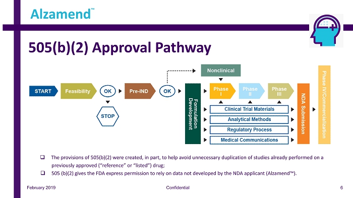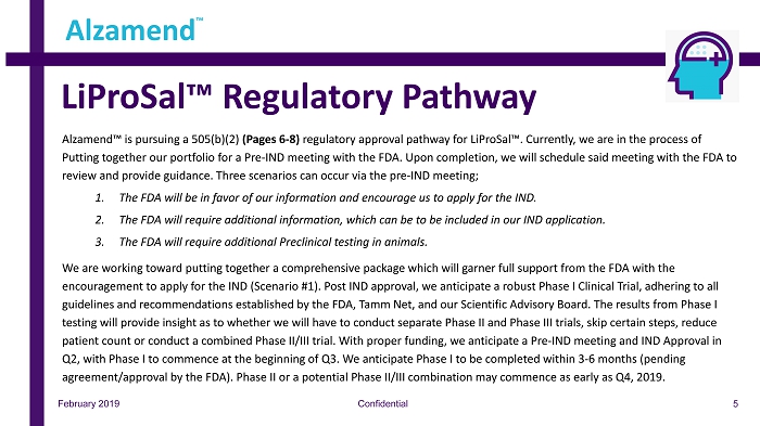 LiProSal™ Regulatory Pathway Alzamend™ is pursuing a 505(b)(2) (Pages 6 - 8) regulatory approval pathway for LiProSal™. Currently, we are in the process of Putting together our portfolio for a Pre - IND meeting with the FDA. Upon completion, we will schedule said meeting with the FDA t o review and provide guidance. Three scenarios can occur via the pre - IND meeting; 1. The FDA will be in favor of our information and encourage us to apply for the IND. 2. The FDA will require additional information, which can be to be included in our IND application. 3. The FDA will require additional Preclinical testing in animals. We are working toward putting together a comprehensive package which will garner full support from the FDA with the encouragement to apply for the IND (Scenario #1). Post IND approval, we anticipate a robust Phase I Clinical Trial, adhering to all guidelines and recommendations established by the FDA, Tamm Net, and our Scientific Advisory Board. The results from Phase I testing will provide insight as to whether we will have to conduct separate Phase II and Phase III trials, skip certain steps , r educe patient count or conduct a combined Phase II/III trial. With proper funding, we anticipate a Pre - IND meeting and IND Approval in Q2, with Phase I to commence at the beginning of Q3. We anticipate Phase I to be completed within 3 - 6 months (pending agreement/approval by the FDA). Phase II or a potential Phase II/III combination may commence as early as Q4, 2019. February 2019 Confidential Alzamend ™ 5