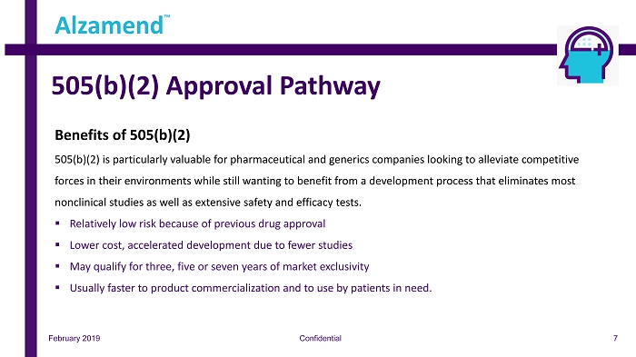 505(b)(2) Approval Pathway February 2019 Confidential Alzamend ™ 6 □ The provisions of 505 (b)( 2 ) were created, in part, to help avoid unnecessary duplication of studies already performed on a previously approved (“reference” or “listed”) drug ; □ 505 (b)( 2 ) gives the FDA express permission to rely on data not developed by the NDA applicant (Alzamend™) .