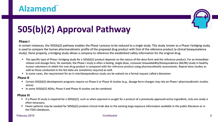 505(b)(2) Approval Pathway February 2019 Confidential Alzamend ™ 7 Benefits of 505(b)(2) 505(b)(2) is particularly valuable for pharmaceutical and generics companies looking to alleviate competitive forces in their environments while still wanting to benefit from a development process that eliminates most nonclinical studies as well as extensive safety and efficacy tests. ▪ Relatively low risk because of previous drug approval ▪ Lower cost, accelerated development due to fewer studies ▪ May qualify for three, five or seven years of market exclusivity ▪ Usually faster to product commercialization and to use by patients in need.