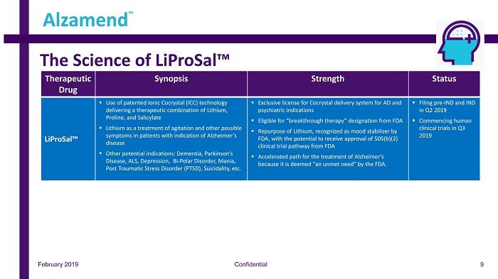 The current target by Alzamend™ for an NDA exploits the enhanced absorption of ionic cocrystals of lithium (LiProSal™) into brain tissue, providing an opportunity to explore additional indications that may require relatively high brain lithium concentrati ons , such as for neurodegenerative disorders (Alzheimer’s, Parkinson’s, ALS, etc.). For these disorders, higher (or lower) brain l ith ium concentrations may be needed compared to those needed for mood disorders and so dose finding studies may be needed. If higher brain concentrations are needed for treatment of neurodegenerative disorders than mood disorders, systemic toxicity ma y only be avoidable by virtue of enhanced brain lithium distribution when using an ionic cocrystal lithium (LiProSal™) formulation, whereas traditional lithium dosage forms would have an unacceptable safety profile when achieving comparable brain lithium concentrations. If lower brain concentrations are needed for treatment of neurodegenerative disorders than mood disorders, systemic toxicity may not present when using an ionic cocrystal lithium formulation and so no therapeutic drug monitoring wou ld be needed. An ionic cocrystal lithium (LiProSal™) formulation may importantly expand the range of therapeutic categories amenable to lithium treatments, with enhanced safety. February 2019 Confidential Alzamend ™ 4 LiProSal™ Per TAMM NET “Our game plan is to go after Neurodegenerative disorders (Alzheimer) because of the fast - track designation associated with the diseases . Additionally, upon approval of LiProSal™ for Alzheimer’s, because we will have proven its enhanced safety, physicians will be able to prescribe it off - label for psychiatric disorders” .