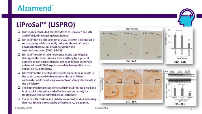LiProSal™ (LISPRO) Confidential 10 Alzamend ™ February 2019 □ Our studies concluded that low doses of LiProSal™ are safe and effective in reducing AD pathology. □ LiProSal™ has no effect on renal COX2 activity, a biomarker of renal toxicity, while markedly reducing abnormal .beta. - amyloid pathology, tau phosphorylation and neuroinflammation (FIGS. 14 - 15). □ LiProSal™ treatment did not induce tissue pathological damage in the heart, kidney, liver, and lung by a general autopsy. In contrast, equimolar doses of lithium carbonate enhanced renal COX2 expression while having little or no impact on AD pathology. □ LiProSal™ at the effective dose yields higher lithium levels in the brain compared with equimolar doses of lithium carbonate, while producing low nontoxic steady state levels in the periphery. □ The improved pharmacokinetics of LiProSal™ in the blood and brain explains its enhanced effectiveness and safety for treating AD compared with lithium carbonate. □ These results confirm and build upon recent studies indicating that low lithium doses can be effective in AD treatment. (LI 2 CO 3 ) (LISPRO/Tg2576) (Control) (LI 2 CO 3 ) (Control) (LISPRO)