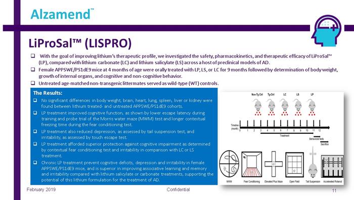 LiProSal™ (LISPRO) Confidential 11 Alzamend ™ February 2019 □ With the goal of improving lithium’s therapeutic profile, we investigated the safety, pharmacokinetics, and therapeutic effic ac y of LiProSal™ (LP), compared with lithium carbonate (LC) and lithium salicylate (LS) across a host of preclinical models of AD. □ Female APPSWE/PS1dE9 mice at 4 months of age were orally treated with LP, LS, or LC for 9 months followed by determination of bo dy weight, growth of internal organs, and cognitive and non - cognitive behavior. □ Untreated age - matched non - transgenic littermates served as wild - type (WT) controls. The Results: □ No significant differences in body weight, brain, heart, lung, spleen, liver or kidney were found between lithium treated - and untreated APPSWE/PS1dE9 cohorts. □ LP treatment improved cognitive function, as shown by lower escape latency during training and probe trial of the Morris water maze (MWM) test and longer contextual freezing time during the fear conditioning test. □ LP treatment also reduced depression, as assessed by tail suspension test, and irritability, as assessed by touch escape test. □ LP treatment afforded superior protection against cognitive impairment as determined by contextual fear conditioning test and irritability in comparison with LC or LS treatment. □ Chronic LP treatment prevent cognitive deficits, depression and irritability in female APPSWE/PS1dE9 mice, and is superior in improving associative learning and memory and irritability compared with lithium salicylate or carbonate treatments, supporting the potential of this lithium formulation for the treatment of AD.