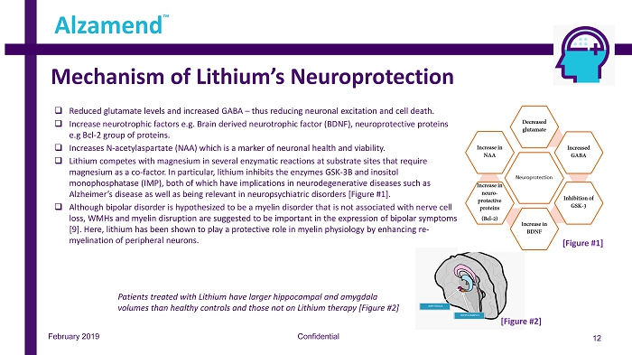 Mechanism of Lithium’s Neuroprotection Confidential 12 Alzamend ™ February 2019 □ Reduced glutamate levels and increased GABA – thus reducing neuronal excitation and cell death. □ Increase neurotrophic factors e.g. Brain derived neurotrophic factor (BDNF), neuroprotective proteins e.g Bcl - 2 group of proteins. □ Increases N - acetylaspartate (NAA) which is a marker of neuronal health and viability. □ Lithium competes with magnesium in several enzymatic reactions at substrate sites that require magnesium as a co - factor. In particular, lithium inhibits the enzymes GSK - 3B and inositol monophosphatase (IMP), both of which have implications in neurodegenerative diseases such as Alzheimer’s disease as well as being relevant in neuropsychiatric disorders [Figure #1]. □ Although bipolar disorder is hypothesized to be a myelin disorder that is not associated with nerve cell loss, WMHs and myelin disruption are suggested to be important in the expression of bipolar symptoms [9]. Here, lithium has been shown to play a protective role in myelin physiology by enhancing re - myelination of peripheral neurons. [Figure #1] Patients treated with Lithium have larger hippocampal and amygdala volumes than healthy controls and those not on Lithium therapy [Figure #2] [Figure #2]