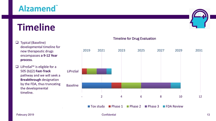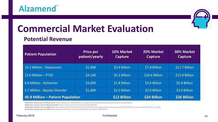 February 2019 Confidential Timeline Alzamend ™ - 2 4 6 8 10 12 Baseline LiProSal Timeline for Drug Evaluation Tox study Phase 1 Phase 2 Phase 3 FDA Review 2019 20 21 2023 2025 2027 2029 2031 □ Typical (Baseline) developmental timeline for new therapeutic drugs encompasses a 9 - 12 Year process . □ LiProSal™ is eligible for a 505 (b)(2) Fast - Track pathway and we will seek a Breakthrough designation by the FDA, thus truncating the developmental timeline. 13
