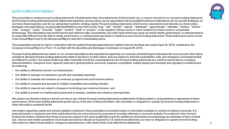 SAFE HARBOR STATEMENT 2 This presentation contains forward - looking statements. All statements other than statements of historical fact are, or may be de emed to be, forward - looking statements. Such forward - looking statements include statements regarding, among others, (a) our expectations about possible business combina tions, (b) our growth strategies, (c) our future financing plans, and (d) our anticipated needs for working capital. Forward - looking statements, which involve assumpt ions and describe our future plans, strategies, and expectations, are generally identifiable by use of the words “may,” “will,” “should,” “expect,” “anticipate,” “a pproximate,” “estimate,” “believe,” “intend,” “plan,” “budget,” “could,” “forecast,” “might,” “predict,” “shall” or “project,” or the negative of these words or other vari ati ons on these words or comparable terminology. This information may involve known and unknown risks, uncertainties, and other factors that may cause our actual re sults, performance, or achievements to be materially different from the future results, performance, or achievements expressed or implied by any forward - looking statem ents. These statements may be found in the Annual Report and in the Semiannual Report referred to immediately below. This presentation should be read in conjunction with the audited financial statements and related notes for the fiscal year e nde d April 30, 2019, contained in the Company’s Annual Report on Form 1 - K, as filed with the Securities and Exchange Commission on August 28, 2019. Forward - looking statements are based on our current expectations and assumptions regarding our business, potential target busine sses, the economy and other future conditions. Because forward - looking statements relate to the future, by their nature, they are subject to inherent uncertainties , risks, and changes in circumstances that are difficult to predict. Our actual results may differ materially from those contemplated by the forward - looking statements as a result of various factors, including, without limitation, changes in local, regional, national or global political, economic, business, competitive, market (supply an d demand) and regulatory conditions and the following: • Our ability to effectively execute our business plan; • Our ability to manage our expansion, growth and operating expenses; • Our ability to evaluate and measure our business, prospects and performance metrics; • Our ability to compete and succeed in a highly competitive and evolving industry; • Our ability to respond and adapt to changes in technology and customer behavior; and • Our ability to protect our intellectual property and to develop, maintain and enhance a strong brand. We caution you therefore that you should not rely on any of these forward - looking statements as statements of historical fact or as guarantees or assurances of future performance. All forward - looking statements speak only as of the date of this presentation. We undertake no obligation to update any forward - looking statements or other information contained herein. Information regarding market and industry statistics contained in this presentation is included based on information availabl e t o us that we believe is accurate. It is generally based on academic and other publications that are not produced for purposes of securities offerings or economic ana lys is. Forecasts and other forward - looking information obtained from these sources are subject to the same qualifications and the additional uncertainties accom pan ying any estimates of future market size, revenue and market acceptance of products and services. Except as required by U.S. federal securities laws, we have no obl igation to update forward - looking information to reflect actual results or changes in assumptions or other factors that could affect those statements.