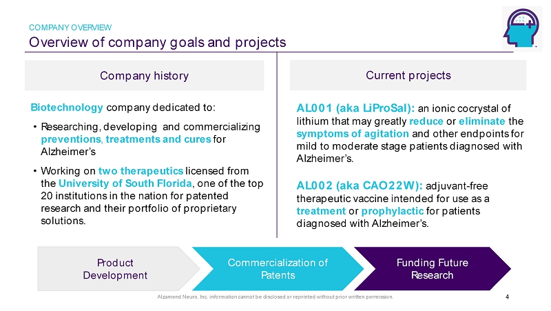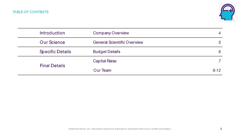 Alzamend Neuro, Inc. information cannot be disclosed or reprinted without prior written permission. TABLE OF CONTENTS 3 Introduction Company Overview 4 Our Science General Scientific Overview 5 Specific Details Budget Details 6 Final Details Capital Raise 7 Our Team 8 - 12