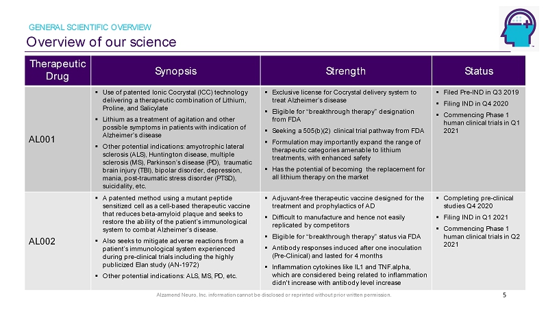 Alzamend Neuro, Inc. information cannot be disclosed or reprinted without prior written permission. Overview of company goals and projects COMPANY OVERVIEW Company history Current projects 4 AL001 (aka LiProSal): an ionic cocrystal of lithium that may greatly reduce or eliminate the symptoms of agitation and other endpoints for mild to moderate stage patients diagnosed with Alzheimer’s. AL002 (aka CAO22W): adjuvant - free therapeutic vaccine intended for use as a treatment or prophylactic for patients diagnosed with Alzheimer’s. Biotechnology company dedicated to: • Researching, developing and commercializing preventions , treatments and cures for Alzheimer’s • Working on two therapeutics licensed from the University of South Florida , one of the top 20 institutions in the nation for patented research and their portfolio of proprietary solutions. Commercialization of Patents Funding Future Research Product Development