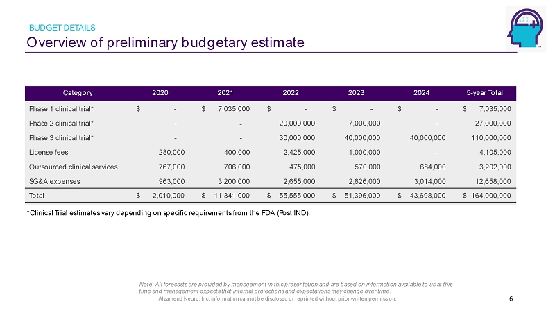 Alzamend Neuro, Inc. information cannot be disclosed or reprinted without prior written permission. Overview of our science GENERAL SCIENTIFIC OVERVIEW 5 Therapeutic Drug Synopsis Strength Status AL001 ▪ Use of patented Ionic Cocrystal (ICC) technology delivering a therapeutic combination of Lithium, Proline, and Salicylate ▪ Lithium as a treatment of agitation and other possible symptoms in patients with indication of Alzheimer’s disease ▪ Other potential indications: amyotrophic lateral sclerosis (ALS), Huntington disease, multiple sclerosis (MS), Parkinson’s disease (PD ), traumatic brain injury (TBI), bipolar disorder, depression, mania, post - traumatic stress disorder (PTSD), suicidality, etc. ▪ Exclusive license for Cocrystal delivery system to treat Alzheimer’s disease ▪ Eligible for “breakthrough therapy” designation from FDA ▪ Seeking a 505(b)(2) clinical trial pathway from FDA ▪ Formulation may importantly expand the range of therapeutic categories amenable to lithium treatments, with enhanced safety ▪ Has the potential of becoming the replacement for all lithium therapy on the market ▪ Filed Pre - IND in Q3 2019 ▪ Filing IND in Q4 2020 ▪ Commencing Phase 1 human clinical trials in Q1 2021 AL002 ▪ A patented method using a mutant peptide sensitized cell as a cell - based therapeutic vaccine that reduces beta - amyloid plaque and seeks to restore the ability of the patient’s immunological system to combat Alzheimer’s disease. ▪ Also seeks to mitigate adverse reactions from a patient’s immunological system experienced during pre - clinical trials including the highly publicized Elan study (AN - 1972) ▪ Other potential indications: ALS, MS, PD, etc. ▪ Adjuvant - free therapeutic vaccine designed for the treatment and prophylactics of AD ▪ Difficult to manufacture and hence not easily replicated by competitors ▪ Eligible for “breakthrough therapy” status via FDA ▪ Antibody responses induced after one inoculation (Pre - Clinical) and lasted for 4 months ▪ Inflammation cytokines like IL1 and TNF.alpha, which are considered being related to inflammation didn't increase with antibody level increase ▪ Completing pre - clinical studies Q4 2020 ▪ Filing IND in Q1 2021 ▪ Commencing Phase 1 human clinical trials in Q2 2021