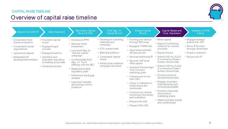 Alzamend Neuro, Inc. information cannot be disclosed or reprinted without prior written permission. Overview of preliminary budgetary estimate BUDGET DETAILS 6 Category 2020 2021 2022 2023 2024 5 - year Total Phase 1 clinical trial* $ 7,035,000 $ - $ - $ - $ 7 ,035,000 $ Phase 2 clinical trial* - 20 ,000,000 7,000,000 - 27,000,000 Phase 3 clinical trial* - - 30,000,000 40,000,000 40,000,000 110,000,000 License fees 280,000 400,000 2,425,000 1,000,000 - 4,105,000 Outsourced clinical services 767,000 70 6,000 475,000 570,000 684,000 3,202,000 SG&A expenses 963,000 3 ,200,000 2,655,000 2,826,000 3,014,000 12,658,000 Total 2 ,010,000 $ 1 1 , 341 ,000 $ 55 ,555,000 $ 51,396,000 $ 43,698,000 $ 164,000,000 $ - - *Clinical Trial estimates vary depending on specific requirements from the FDA (Post IND). Note: All forecasts are provided by management in this presentation and are based on information available to us at this time and management expects that internal projections and expectations may change over time.