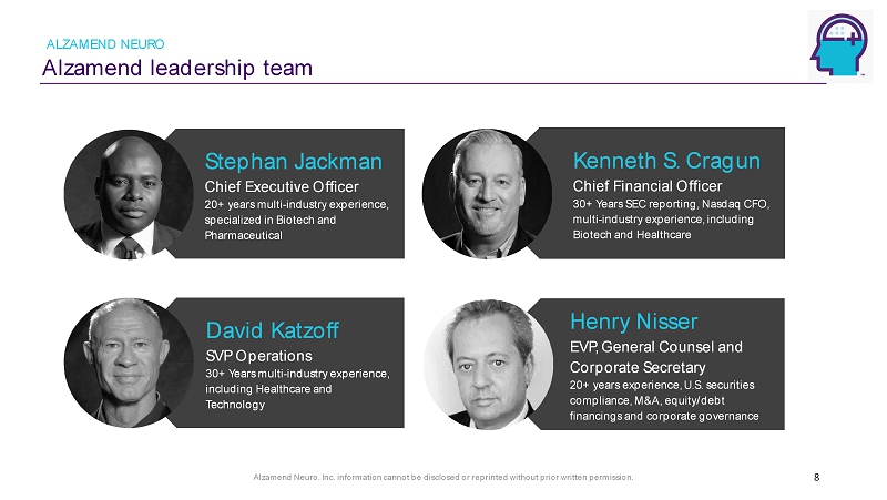 Alzamend Neuro, Inc. information cannot be disclosed or reprinted without prior written permission. Overview of capital raise timeline CAPITAL RAISE TIMELINE 7 Secure CAO22W IP • Completed initial license evaluation • Completed license negotiations • Agreement signed • Established IP development timeline Start Alzamend • Founders capital round • Engaged legal counsel • Engaged auditors • Identified and evaluated regulatory consulting proposals • Developed brand Secondary Capital Round $1MM • Developed PPM • Secured initial investment • Launched Reg A+ “test the waters” campaign • Confidentially filed Reg. A+ Tier II offering with the SEC • Established initial regulatory path • Performed initial gap analysis • Launched website and primary online presence Initial Reg. A+ Capital Round • Developed marketing materials and campaign • DTC market tests • Beta test platform • Completed capital round • Initial public relations campaign launched Bridge Capital Round • Funding pre - clinical through IND prep • Engaged TAMM Net • Appointed scientific advisory board • Secured additional IP • Secured USF local office space • Awarded Florida High Tech Corridor matching grant • Transitioned to full - time CEO • Active in Alzheimer’s conferences and community • Conduct pre - clinical toxicology mice study and evaluation • Prepare Pre - IND • Prepare FDA IND Capital Raises and Corp. Expansion • Raise capital • Support continuing research for current products • Expand board • Submit IND for AL001 & commence Phase I human clinical trials • Submit IND for AL002 & commence Phase I human clinical trials • Develop product development plans • Engage chemistry, manufacturing and controls specialists • Develop corporate and product marketing plans • Attend industry events and conferences Nasdaq or NYSE Listing • Engage strategic partners for IPO • Move IP forward through clinal trials • Invest in research • Secure new IP