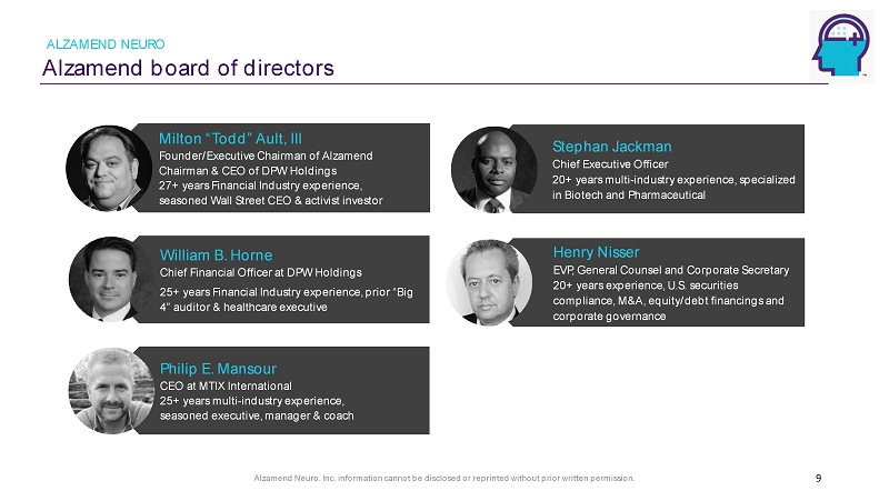 Alzamend Neuro, Inc. information cannot be disclosed or reprinted without prior written permission. Alzamend leadership team ALZAMEND NEURO 8 Stephan Jackman Chief Executive Officer 20+ years multi - industry experience, specialized in Biotech and Pharmaceutical David Katzoff SVP Operations 30+ Years multi - industry experience, including Healthcare and Technology Kenneth S. Cragun Chief Financial Officer 30+ Years SEC reporting, Nasdaq CFO, multi - industry experience, including Biotech and Healthcare Henry Nisser EVP, General Counsel and Corporate Secretary 20+ years experience, U.S. securities compliance, M&A, equity/debt financings and corporate governance