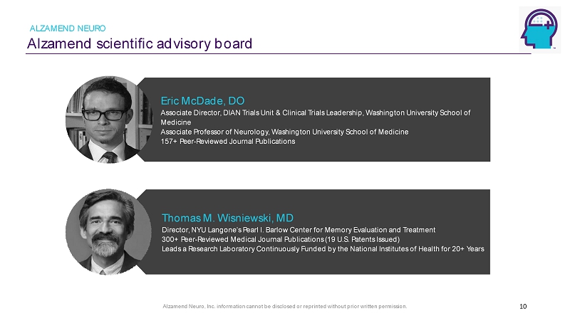 Alzamend Neuro, Inc. information cannot be disclosed or reprinted without prior written permission. Alzamend board of directors ALZAMEND NEURO 9 Milton “Todd” Ault, III Founder/Executive Chairman of Alzamend Chairman & CEO of DPW Holdings 27+ years Financial Industry experience, seasoned Wall Street CEO & activist investor William B. Horne Chief Financial Officer at DPW Holdings 25+ years Financial Industry experience, prior “Big 4” auditor & healthcare executive Philip E. Mansour CEO at MTIX International 25+ years multi - industry experience, seasoned executive, manager & coach Henry Nisser EVP, General Counsel and Corporate Secretary 20+ years experience, U.S. securities compliance, M&A, equity/debt financings and corporate governance Stephan Jackman Chief Executive Officer 20+ years multi - industry experience, specialized in Biotech and Pharmaceutical