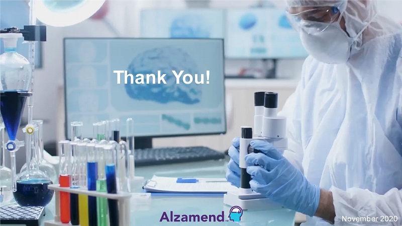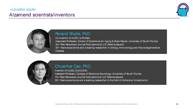 Alzamend Neuro, Inc. information cannot be disclosed or reprinted without prior written permission. Alzamend scientific advisory board ALZAMEND NEURO 10 Eric McDade , DO Associate Director, DIAN Trials Unit & Clinical Trials Leadership, Washington University School of Medicine Associate Professor of Neurology, Washington University School of Medicine 157+ Peer - Reviewed Journal Publications Thomas M. Wisniewski, MD Director, NYU Langone’s Pearl I. Barlow Center for Memory Evaluation and Treatment 300+ Peer - Reviewed Medical Journal Publications (19 U.S. Patents Issued) Leads a Research Laboratory Continuously Funded by the National Institutes of Health for 20+ Years