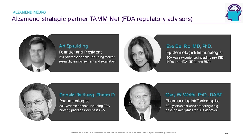 Alzamend Neuro, Inc. information cannot be disclosed or reprinted without prior written permission. Alzamend scientists/inventors ALZAMEND NEURO 11 Roland Shytle , PhD. Co - Inventor of AL001 (LiProSal) Associate Professor, Center of Excellence for Aging & Brain Repair, University of South Florida 30+ Peer - Reviewed Journal Publications (2 U.S. Patents Issued) 30+ Years experience and a leading researcher in Allergy, Immunology and Neurodegenerative Disease Chuanhai Cao, PhD. Inventor of AL002 (CAO22W) Assistant Professor, College of Medicine Neurology, University of South Florida 70+ Peer - Reviewed Journal Publications (4 U.S. Patents Issued) 30+ Years experience and a leading researcher in the field of Alzheimer's treatments
