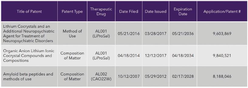 Our current pipeline consists of two novel therapeutic drug candidates: (i) a patented ionic cocrystal technology delivering a therapeutic combination of lithium, proline and salicylate, known as AL001 or LiProSal, through two royalty-bearing exclusive worldwide licenses from the University of South Florida Research Foundation, Inc., as licensor, and (ii) a patented method using a mutant peptide sensitized cell as a cell-based therapeutic vaccine that seeks to restore the ability of a patient’s immunological system to combat Alzheimer’s, known as AL002 or CA022W, through a royalty-bearing exclusive worldwide license from the same licensor.