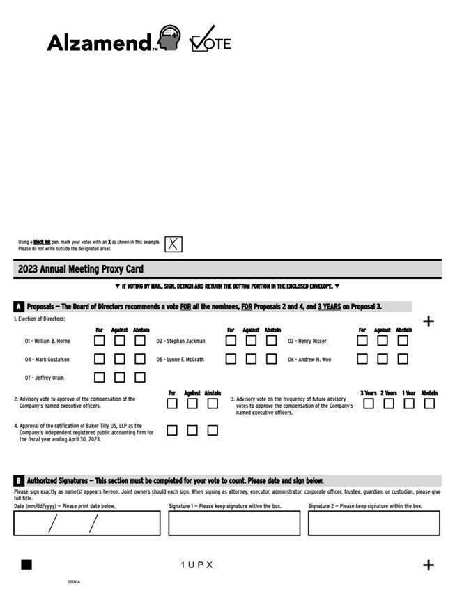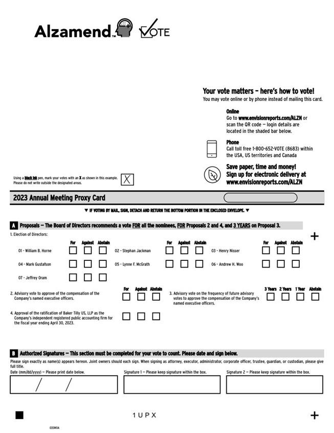 3. Advisory vote on the frequency of future advisoryvotes to approve the compensation of the Company'snamed executive officers.2 Years1 YearAbstain3 Years01 - William B. Horne04 - Mark Gustafson07 - Jeffrey Oram02 - Stephan Jackman05 - Lynne F. McGrath03 - Henry Nisser06 - Andrew H. WooForAgainstAbstainForAgainstAbstainForAgainstAbstain1UPXUsing a black inkpen, mark your votes with an Xas shown in this example.Please do not write outside the designated areas.03SW0A++Proposals ? The Board of Directors recommends a vote FORall the nominees, FORProposals 2 and 4, and 3 YEARSon Proposal 3.A2. Advisory vote to approve of the compensation of theCompany's named executive officers.1. Election of Directors:ForAgainstAbstainPlease sign exactly as name(s) appears hereon. Joint owners should each sign. When signing as attorney, executor, administrator, corporate officer, trustee, guardian, or custodian, please give full title.Signature 1 ? Please keep signature within the box.Signature 2 ? Please keep signature within the box.Date (mm/dd/yyyy) ? Please print date below.Authorized Signatures ? This section must be completed for your vote to count. Please date and sign below.B4. Approval of the ratification of Baker Tilly US, LLP as theCompany's independent registered public accounting firm forthe fiscal year ending April 30, 2023.qIF VOTING BY MAIL, SIGN, DETACH AND RETURN THE BOTTOM PORTION IN THE ENCLOSED ENVELOPE.q2023 Annual Meeting Proxy CardYou may vote online or by phone instead of mailing this card.OnlineGo to www.envisionreports.com/ALZN orscan the QR code ? login details arelocated in the shaded bar below.Save paper, time and money! Sign up for electronic delivery atwww.envisionreports.com/ALZNPhoneCall toll free 1-800-652-VOTE (8683) withinthe USA, US territories and CanadaYour vote matters ? here's how to vote!