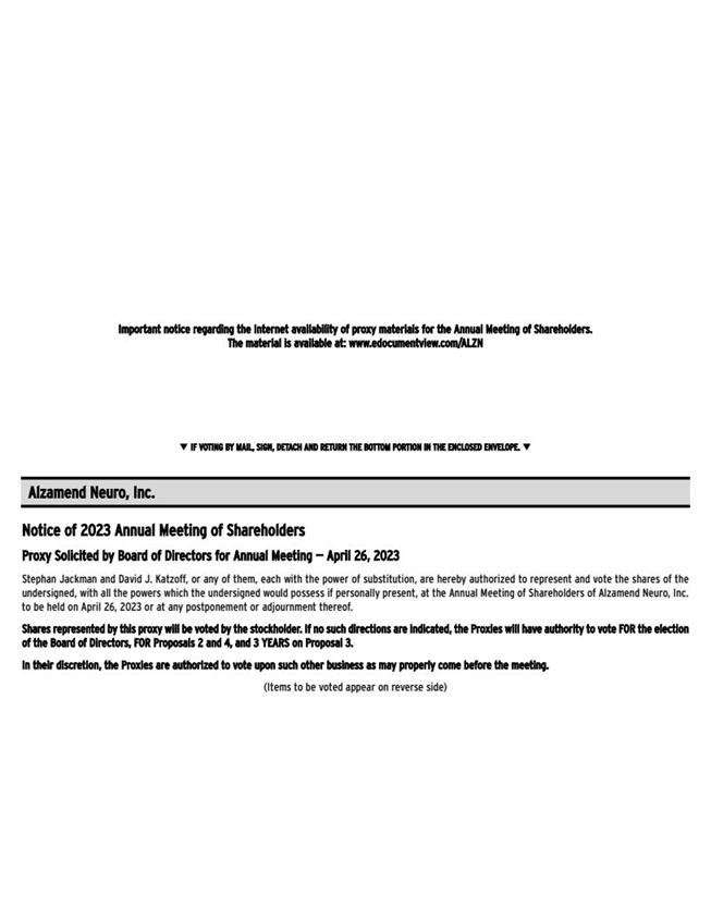 Notice of 2023 Annual Meeting of ShareholdersProxy Solicited by Board of Directors for Annual Meeting ? April 26, 2023Stephan Jackman and David J. Katzoff, or any of them, each with the power of substitution, are hereby authorized to represent and vote the shares of theundersigned, with all the powers which the undersigned would possess if personally present, at the Annual Meeting of Shareholders of Alzamend Neuro, Inc.to be held on April 26, 2023 or at any postponement or adjournment thereof.Shares represented by this proxy will be voted by the stockholder. If no such directions are indicated, the Proxies will have authority to vote FOR the electionof the Board of Directors, FOR Proposals 2 and 4, and 3 YEARS on Proposal 3.In their discretion, the Proxies are authorized to vote upon such other business as may properly come before the meeting.(Items to be voted appear on reverse side)Alzamend Neuro, Inc.qIF VOTING BY MAIL, SIGN, DETACH AND RETURN THE BOTTOM PORTION IN THE ENCLOSED ENVELOPE.qImportant notice regarding the Internet availability of proxy materials for the Annual Meeting of Shareholders. The material is available at: www.edocumentview.com/ALZN