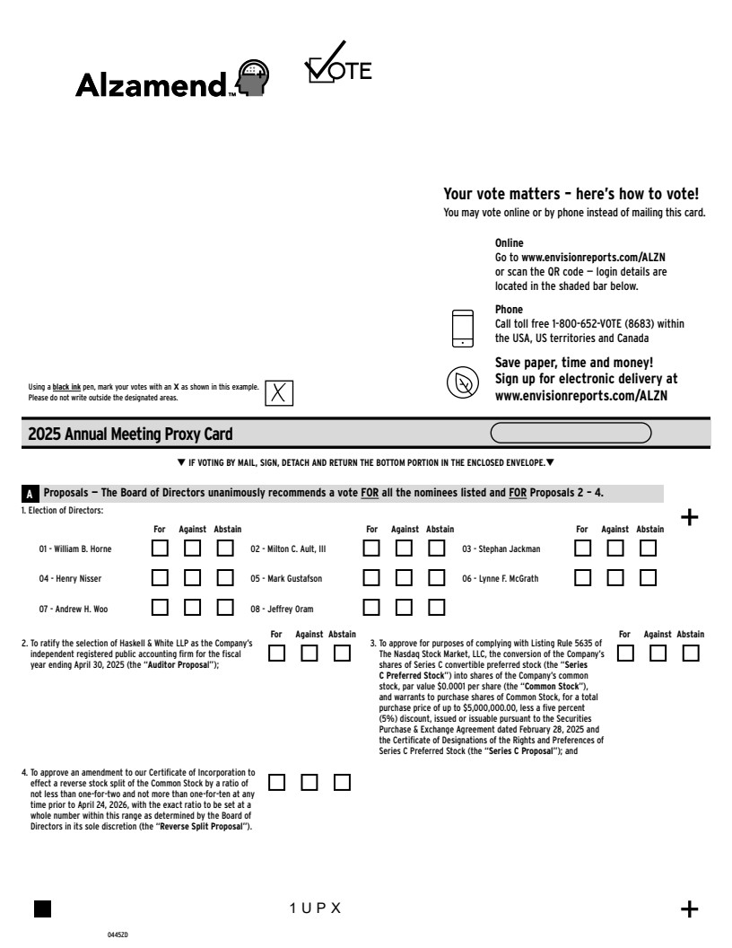 01 - William B. Horne 04 - Henry Nisser07 - Andrew H. Woo02 - Milton C. Ault, III05 - Mark Gustafson08 - Jeffrey Oram 03 - Stephan Jackman06 - Lynne F. McGrath1UPXForAgainstAbstainForAgainstAbstainForAgainstAbstainThe Sample CompanyProposals ? The Board of Directors unanimously recommends a vote FOR all the nominees listed and FOR Proposals 2 ? 4.A0445ZD2. To ratify the selection of Haskell & White LLP as the Company's independent registered public accounting firm for the fiscal year ending April 30, 2025 (the "Auditor Proposal");3. To approve for purposes of complying with Listing Rule 5635 of The Nasdaq Stock Market, LLC, the conversion of the Company's shares of Series C convertible preferred stock (the "Series C Preferred Stock") into shares of the Company's common stock, par value $0.0001 per share (the "Common Stock"), and warrants to purchase shares of Common Stock, for a total purchase price of up to $5,000,000.00, less a five percent (5%) discount, issued or issuable pursuant to the Securities Purchase & Exchange Agreement dated February 28, 2025 and the Certificate of Designations of the Rights and Preferences of Series C Preferred Stock (the "Series C Proposal"); and1. Election of Directors:ForAgainstAbstainForAgainstAbstain4. To approve an amendment to our Certificate of Incorporation to effect a reverse stock split of the Common Stock by a ratio of not less than one-for-two and not more than one-for-ten at any time prior to April 24, 2026, with the exact ratio to be set at a whole number within this range as determined by the Board of Directors in its sole discretion (the "Reverse Split Proposal").2025 Annual Meeting Proxy CardUsing a black ink pen, mark your votes with an X as shown in this example. Please do not write outside the designated areas.qIF VOTING BY MAIL, SIGN, DETACH AND RETURN THE BOTTOM PORTION IN THE ENCLOSED ENVELOPE.qYou may vote online or by phone instead of mailing this card.OnlineGo to www.envisionreports.com/ALZN or scan the QR code ? login details are located in the shaded bar below.Your vote matters ? here's how to vote!Save paper, time and money! Sign up for electronic delivery at www.envisionreports.com/ALZNPhoneCall toll free 1-800-652-VOTE (8683) within the USA, US territories and Canada