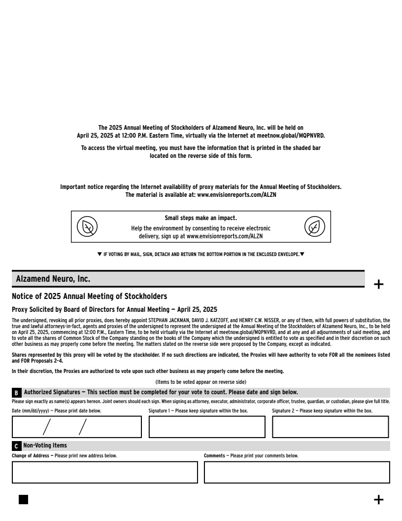 Small steps make an impact.Help the environment by consenting to receive electronic delivery, sign up at www.envisionreports.com/ALZNNotice of 2025 Annual Meeting of StockholdersProxy Solicited by Board of Directors for Annual Meeting ? April 25, 2025The undersigned, revoking all prior proxies, does hereby appoint STEPHAN JACKMAN, DAVID J. KATZOFF, and HENRY C.W. NISSER, or any of them, with full powers of substitution, the true and lawful attorneys-in-fact, agents and proxies of the undersigned to represent the undersigned at the Annual Meeting of the Stockholders of Alzamend Neuro, Inc., to be held on April 25, 2025, commencing at 12:00 P.M., Eastern Time, to be held virtually via the Internet at meetnow.global/MQPNVRD, and at any and all adjournments of said meeting, and to vote all the shares of Common Stock of the Company standing on the books of the Company which the undersigned is entitled to vote as specified and in their discretion on such other business as may properly come before the meeting. The matters stated on the reverse side were proposed by the Company, except as indicated. Shares represented by this proxy will be voted by the stockholder. If no such directions are indicated, the Proxies will have authority to vote FOR all the nominees listed and FOR Proposals 2-4.In their discretion, the Proxies are authorized to vote upon such other business as may properly come before the meeting.(Items to be voted appear on reverse side)Alzamend Neuro, Inc.Non-Voting ItemsCqIF VOTING BY MAIL, SIGN, DETACH AND RETURN THE BOTTOM PORTION IN THE ENCLOSED ENVELOPE.qChange of Address ? Please print new address below.Comments ? Please print your comments below.Please sign exactly as name(s) appears hereon. Joint owners should each sign. When signing as attorney, executor, administrator, corporate officer, trustee, guardian, or custodian, please give full title.Signature 1 ? Please keep signature within the box.Signature 2 ? Please keep signature within the box.Date (mm/dd/yyyy) ? Please print date below.Authorized Signatures ? This section must be completed for your vote to count. Please date and sign below.BImportant notice regarding the Internet availability of proxy materials for the Annual Meeting of Stockholders. The material is available at: www.envisionreports.com/ALZNThe 2025 Annual Meeting of Stockholders of Alzamend Neuro, Inc. will be held on April 25, 2025 at 12:00 P.M. Eastern Time, virtually via the Internet at meetnow.global/MQPNVRD.To access the virtual meeting, you must have the information that is printed in the shaded bar located on the reverse side of this form.